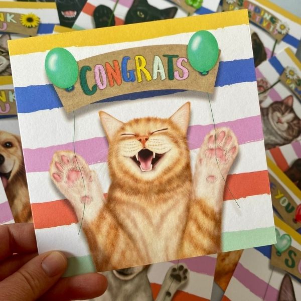 The 'Paws Up' collection covers all sorts of different occasions from Congratulations to Sending Pawsitivity. There are 14 characterful designs, 7 cats and 7 dogs, holding up a multitude of signs to send to someone special.